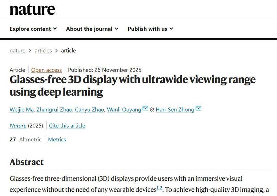 技术界的梦想终于接近现实,因为上海科研人员的创新突破,3D显示效果的完美实现似乎不再遥远。昨天凌晨,《Nature》国际顶尖学术期刊发表了一篇论文,论文由上海人工智能实验室和复旦大学等共同完成,介绍了一种全新裸眼3D显示系统,这种系统解决了业界几十年来的难题:大屏幕与宽视角之间的不可兼得矛盾。
